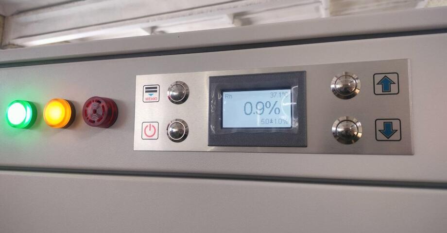 2. Расширенный климатический контроль. Помимо основной функции поддержания сверхнизкой влажности (с точностью ±1% Rh), в шкаф была встроена система нагрева с точной регулировкой температуры в диапазоне от +5°C до +40°C (точность поддержания ±2°C). Эта опция критически важна для хранения материалов, чувствительных не только к влаге, но и к температурным колебаниям, или для проведения определенных технологических выдержек.